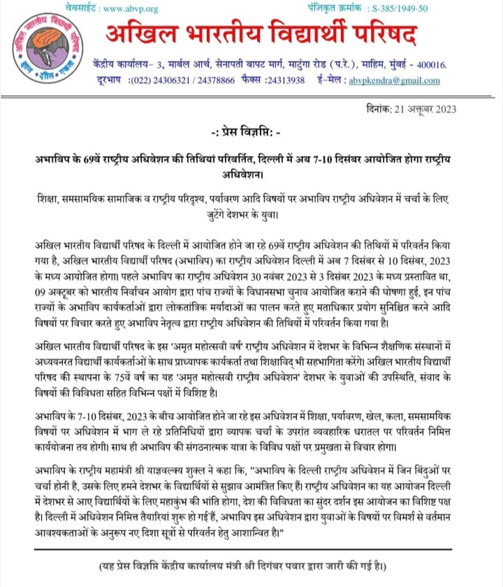 अभाविप के 69वें राष्ट्रीय अधिवेशन की तिथियां परिवर्तित, दिल्ली में अब 7-10 दिसंबर को आयोजित होगा राष्ट्रीय अधिवेशन।